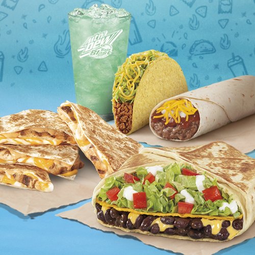 The menu highlights include satisfying meal options like the Meal for 2, featuring two Crunchwrap Supremes alongside Bean Burritos and Soft Tacos, all served with crispy Chips & Nacho Cheese sauce for just $19.52. For a veggie-friendly experience, the Veggie Meal for 2 is a hit at $18.30.